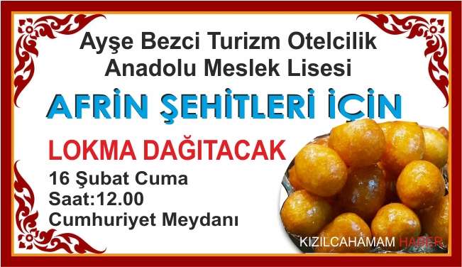 Kızılcahamam Ayşe Bezci Mesleki ve Teknik Turizm Meslek Lisesi Yarın Cuma Namazı öncesi Cumhuriyet meydanında, Türk Silahlı Kuvvetleri (TSK) tarafından Afrin bölgesindeki terör örgütleri PKK/KCK/PYD-YPG ve DEAŞ mensuplarının etkisiz hale getirilmesi amacıyla başlatılan Zeytin Dalı Harekatında şehit olan askerler için lokma dağıtacak