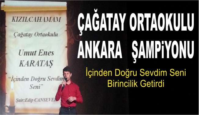 Ankara’nın 25 ilçesinin birincileri, en güzel şiirleri kendilerine has yorumlarıyla dile getirdiler. İlçemizi Çağatay Ortaokulu öğrencisi Umut Enes Karataş temsil etti. Edip CANSEVER’in “İçinden Doğru Sevdim” şiirini en güzel şekilde okuyan öğrencimiz jüriden en yüksek puanı alarak birinciliği elde etti.