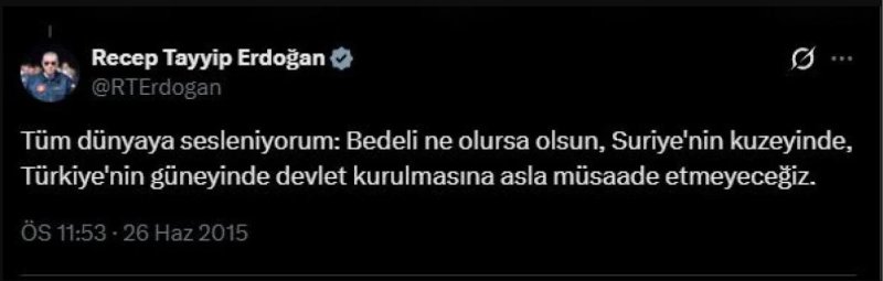 Buradan tüm dünyaya sesleniyorum, Suriye'nin kuzeyinde, güneyimizde bir devlet kurulmasına asla müsaade etmeyeceğiz. Bunun bilinmesini istiyorum. Bedeli ne olursa olsun bu konudaki mücadelemizi sürdüreceğiz.