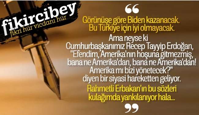 Görünüşe göre Biden kazanacak. Bu Türkiye için iyi olmayacak. Ama neyse ki Cumhurbaşkanımız Recep Tayyip Erdoğan, "Efendim, Amerika'nın hoşuna gitmezmiş, bana ne Amerika'dan, bana ne Amerika'dan! Amerika mı bizi yönetecek?" diyen bir siyasi hareketten geliyor. Rahmetli Erbakan’ın bu sözleri kulağımda yankılanıyor hala…