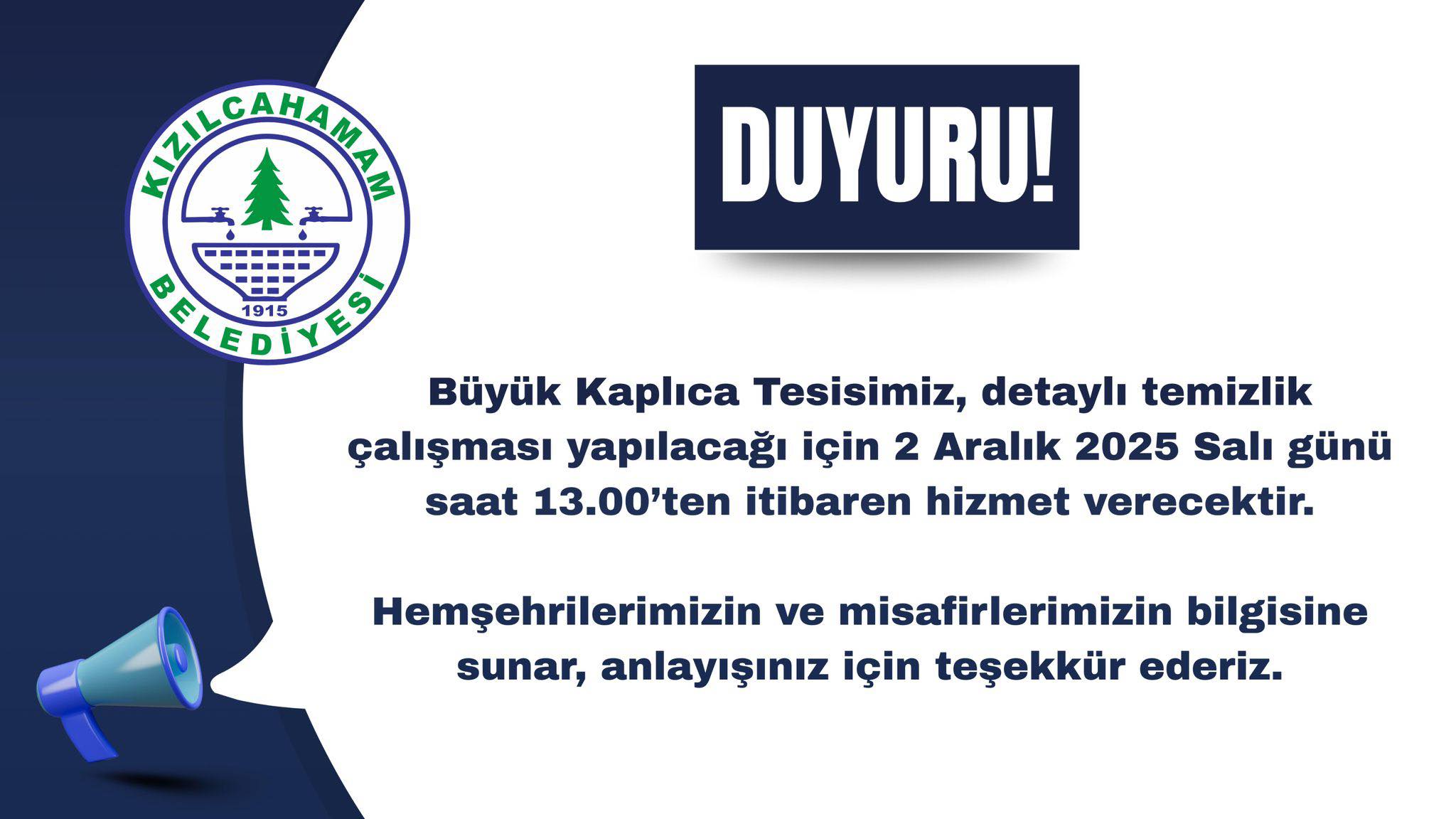 Kullanıcıların 2 Aralık Salı günü öğle saatine kadar kaplıcaya gelmemeleri önemle rica olunur.